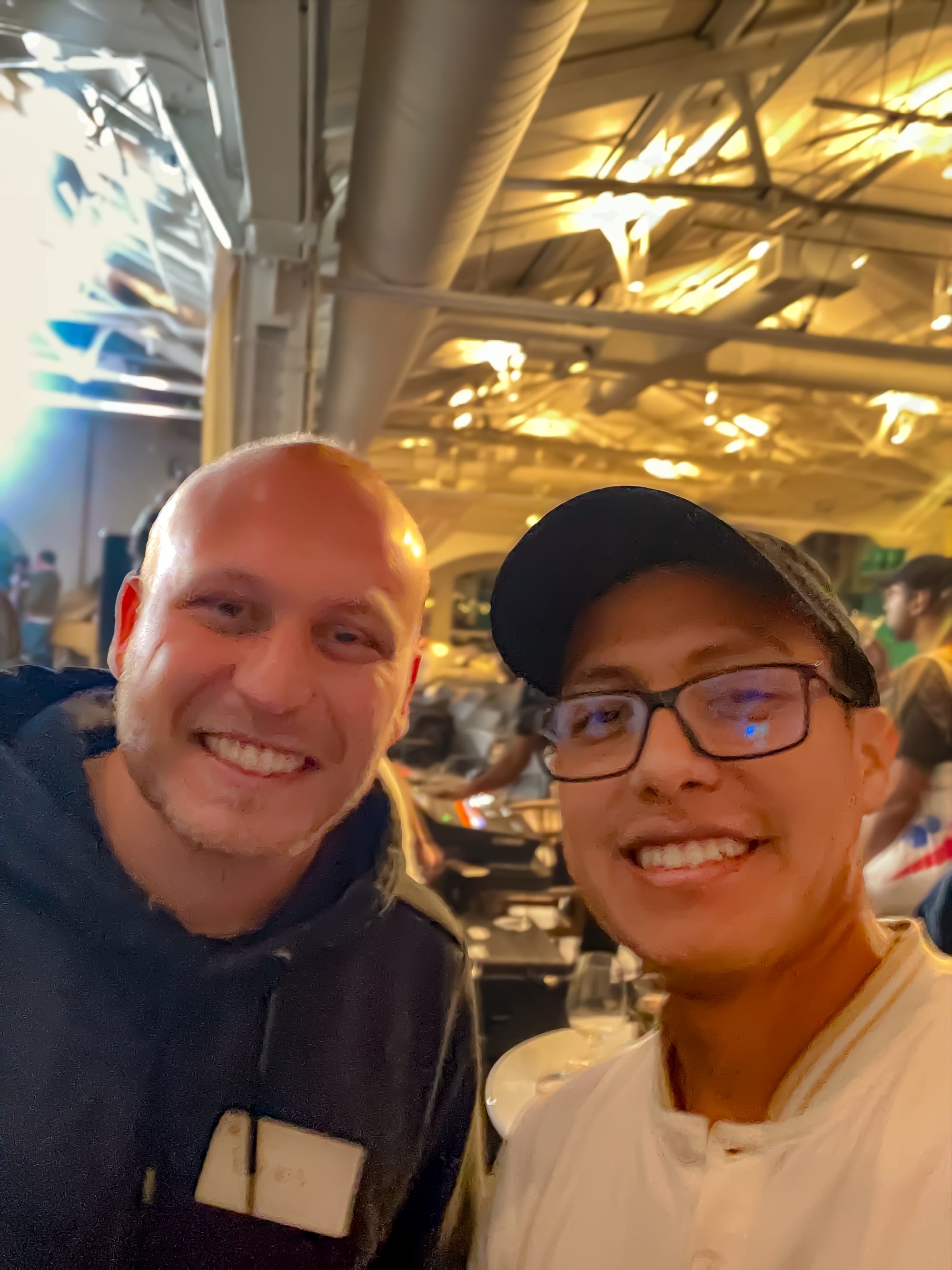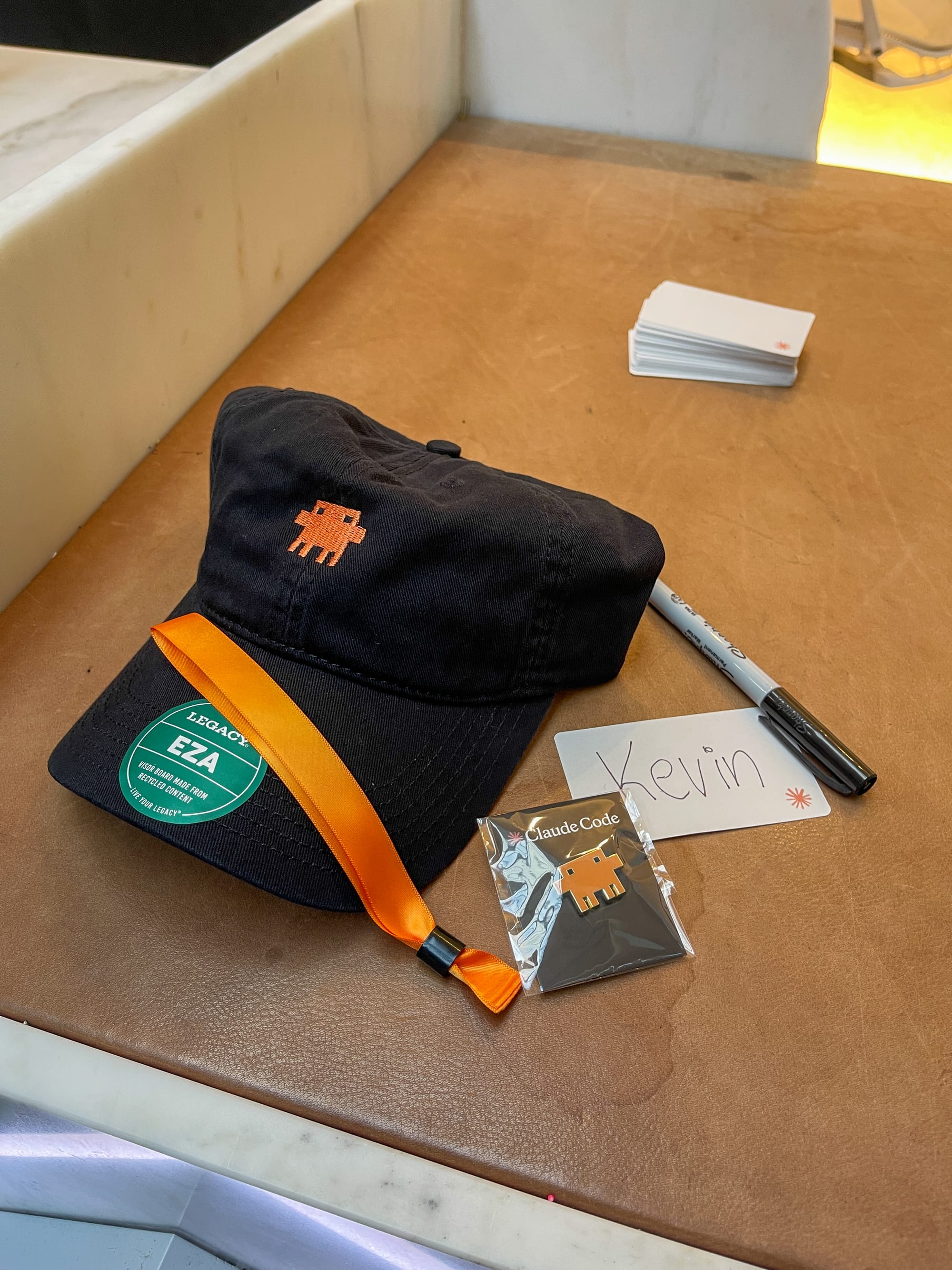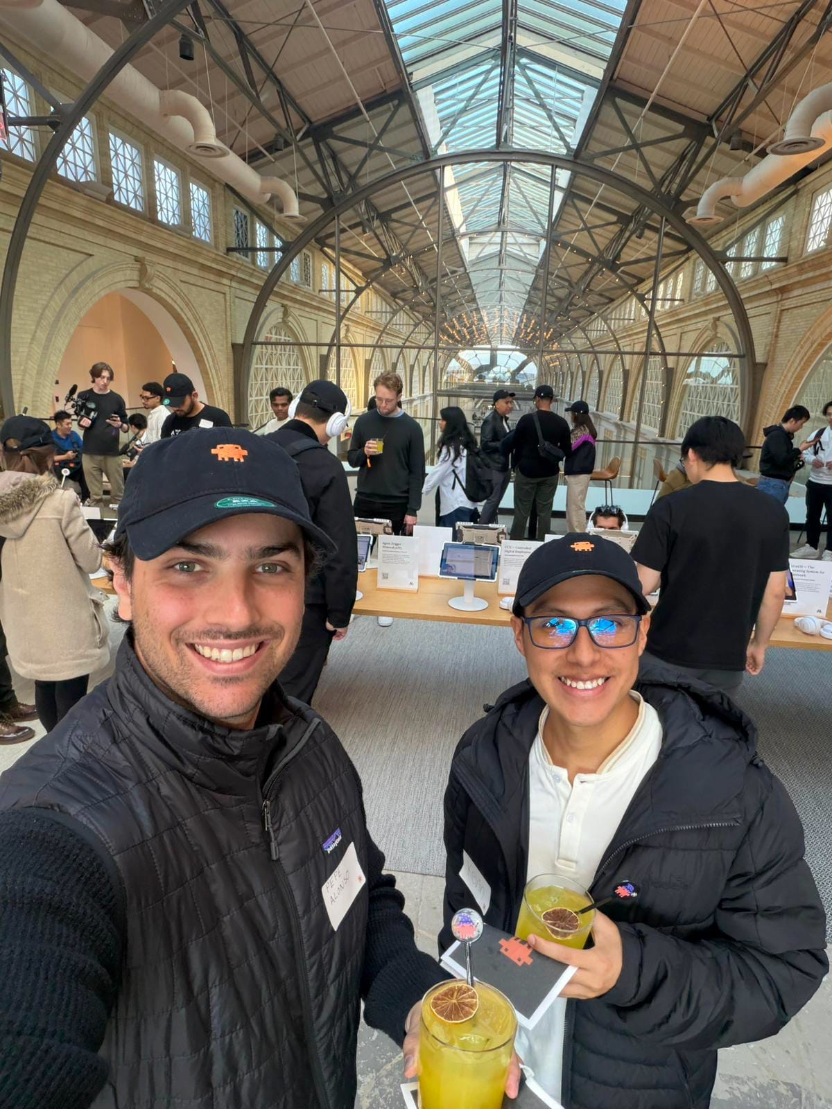 2nd floor of the Ferry Building. Beautiful arched glass ceilings. Everything was branded with the Claude Code pixel art logo. They gave us hats, pins, stickers. Signature cocktails with names like "Claude's Signature" (Reyka vodka, pineapple, nutmeg shrub, ginger beer). My friend Pepe and I walked in wearing our Claude Code hats, cocktails in hand, just soaking it all in.