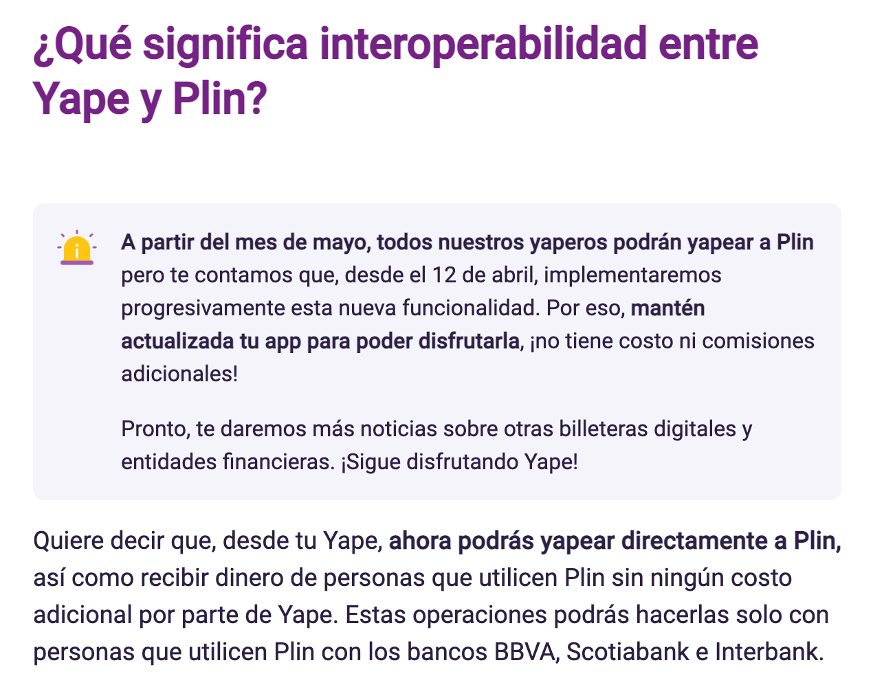 Este es el comunicado oficial de Yape con respecto a la interoperabilidad: